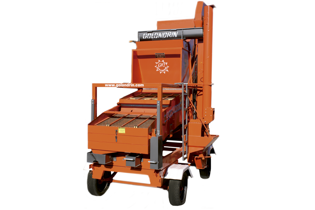 NORIA ADAPTADO A LA MÁQUINA: La noria de descarga es la mejor opción para trabajos a granel ya que directamente el grano ya clasificado es elevado mediante cangilones (evita la ruptura de la semilla) y se puede descargar a cualquier tipo de acopado, carro, etc. La medida estándar es de 3500 mm de alto pero no quita que ha pedido se hace en otras alturas, la misma también rebatible para un mejor traslado.